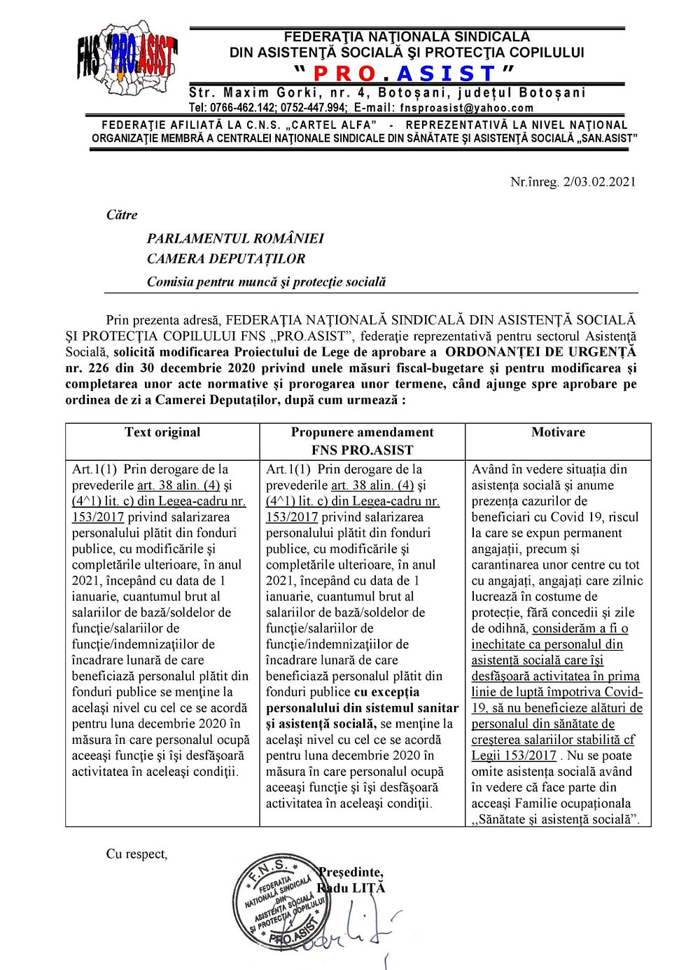 Amendament la OUG nr. 226/2020 promovat de FNS PRO.ASIST